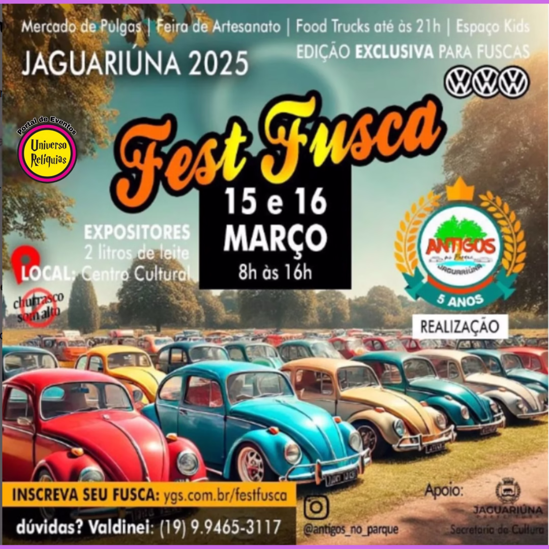 A paixão pelos clássicos está de volta! Nos dias 15 e 16 de março, das 8h às 16h, o Centro Cultural de Jaguariúna será palco de um evento exclusivo para os amantes do Fusca! 🏁✨
