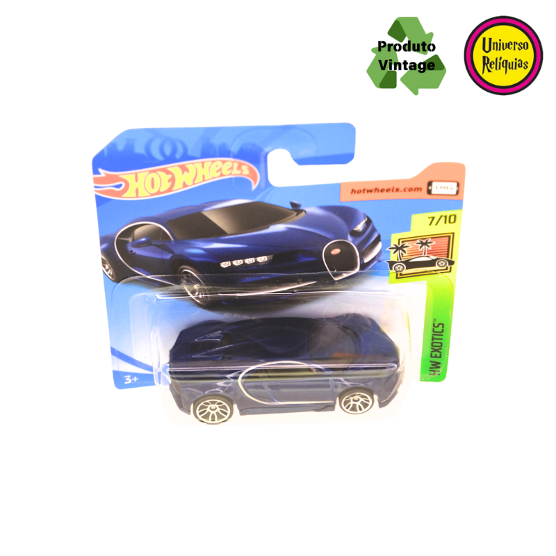 16 Bugatti Chiron azul escuro Hot Wheels Em 2018 na linha mainline HW Exotics da Hot Wheels, sendo marca de carrinhos em miniatura mais famosa do mundo, decidiu trazer toda a emoção e o glamour da Bugatti Chiron para as pistas de brinquedo.