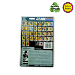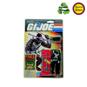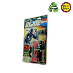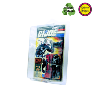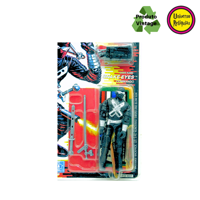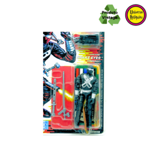 Snake Eyes, um personagem icônico da franquia G.I. Joe. Em 1988 a Hasbro lançou esta versão do Snake Eyes com um design todo preto, característico do Snake Eyes, A embalagem original em perfeito estado de conservação destaca a raridade deste item, acompanha 01 protetor de blister.