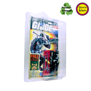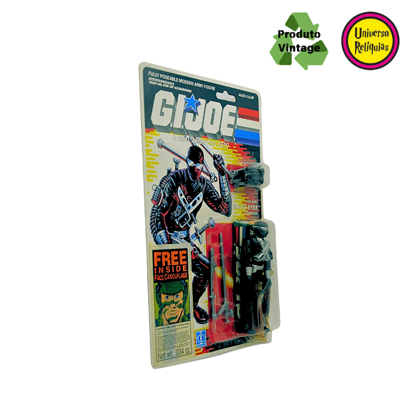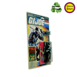 Apresentamos a figura de ação Snake Eyes, um personagem icônico da franquia G.I. Joe. Em 1988 a Hasbro lançou esta versão do Snake Eyes com um design todo preto, característico do Snake Eyes, A embalagem original em perfeito estado de conservação destaca a raridade deste item, acompanha 01 protetor de blister. A menção ao “Free Inside Face Camouflage” (Camuflagem Facial) está claramente visível na frente da embalagem, são 02 saches de pigmento brinde que adiciona elementos interativos, permitindo que os fãs se envolvessem ainda mais no universo do personagem. Atualmente, o “Snake Eyes Commando” de 1988 é considerado um item de colecionador, supervalorizado por entusiastas da linha G.I. Joe.