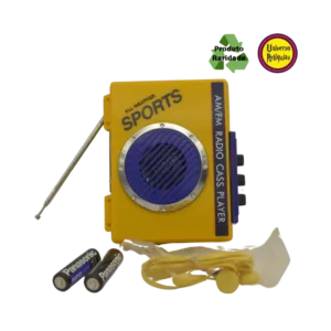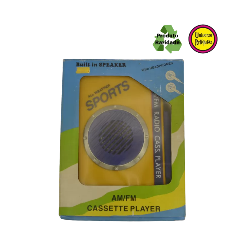 Walkman amarelo original dos anos 80 e 90, com toca fitas K7 e rádio AM e FM com design icônico e robusto, marcou uma geração de amantes da música portátil. Fabricado na China, era popular por sua resistência e estilo vibrante, ideal para aventuras ao ar livre.